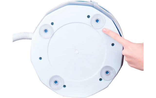 Saugnäpfe auf der Unterseite stabilisieren die Campingschleuder an der Oberfläche.